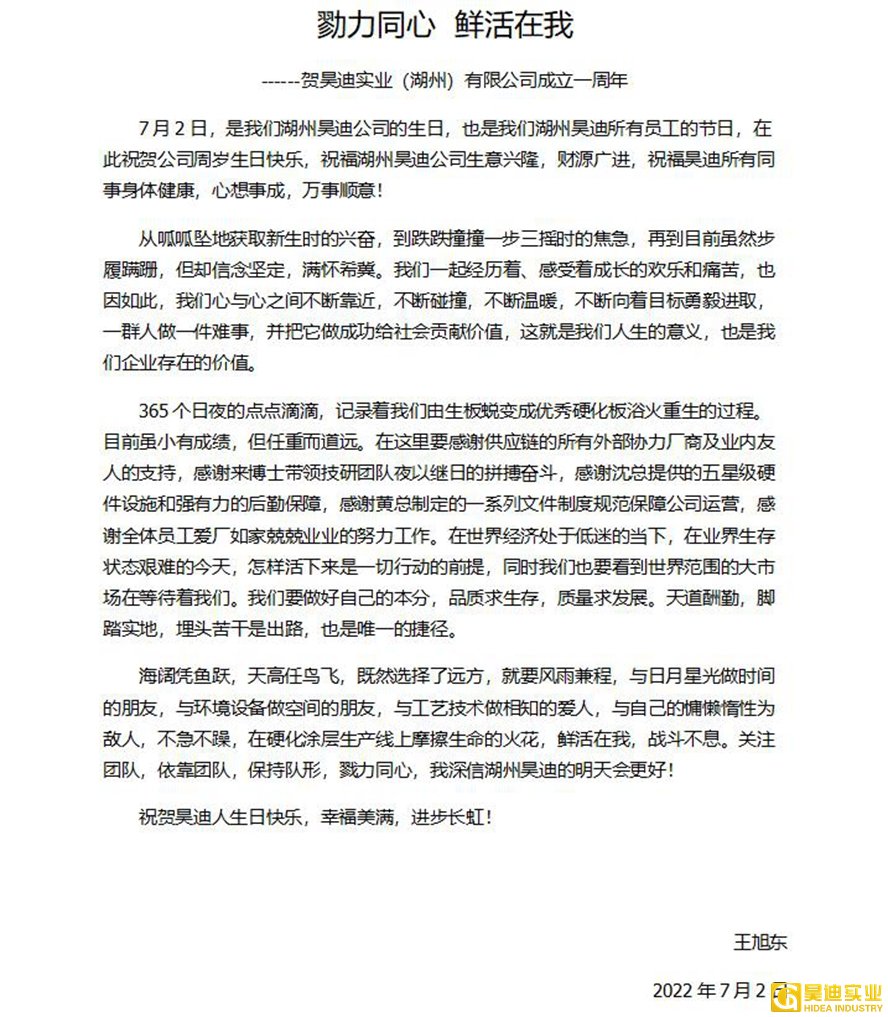 賀昊迪實業(yè)(湖州)有限公司成立一周年